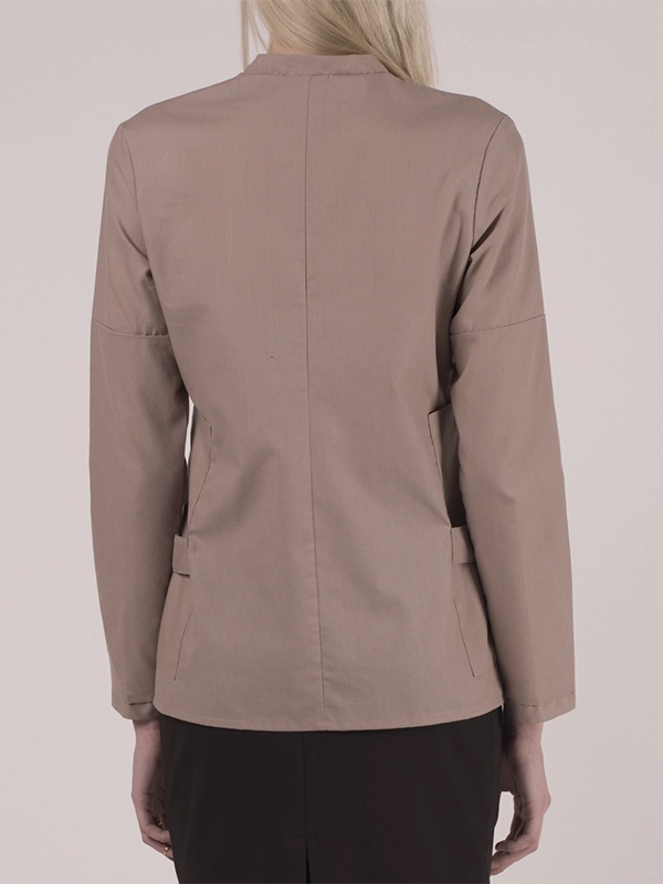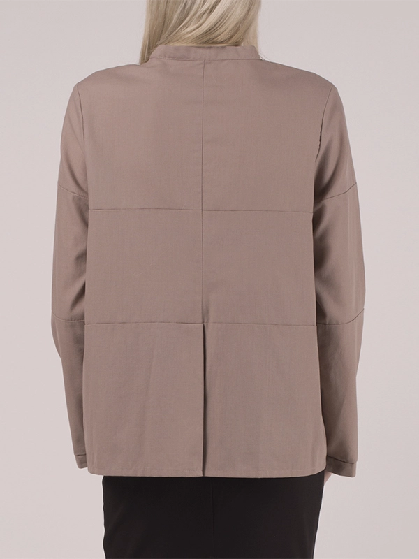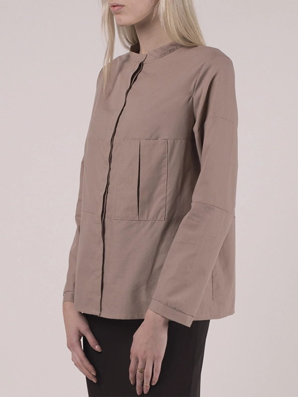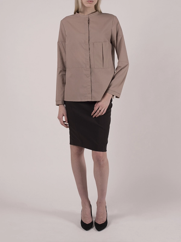 4. Дизайнерская бежевая рубашка свободного кроя с асимметричными декоративными швами. Спереди один карман со складкой. Сзади шлица. Длинный рукав.