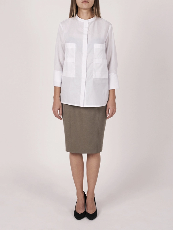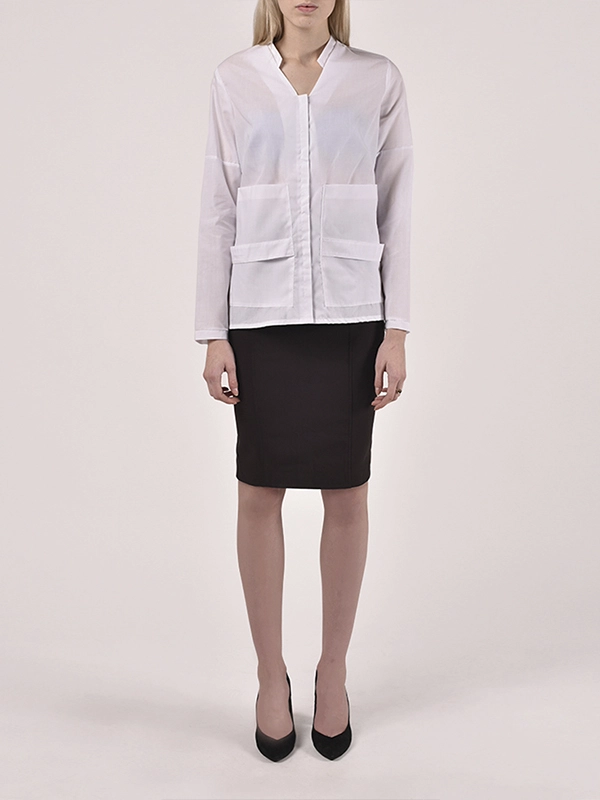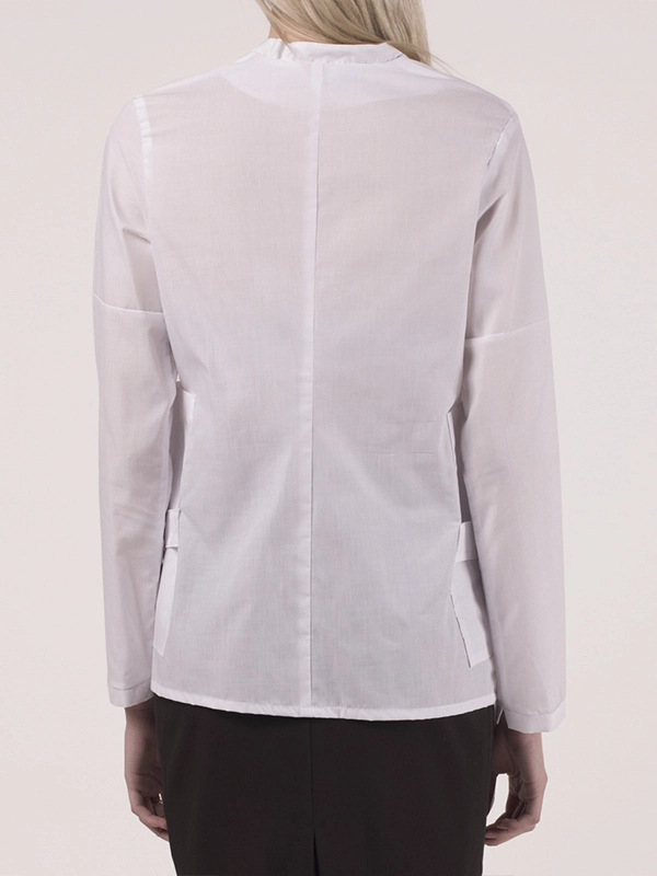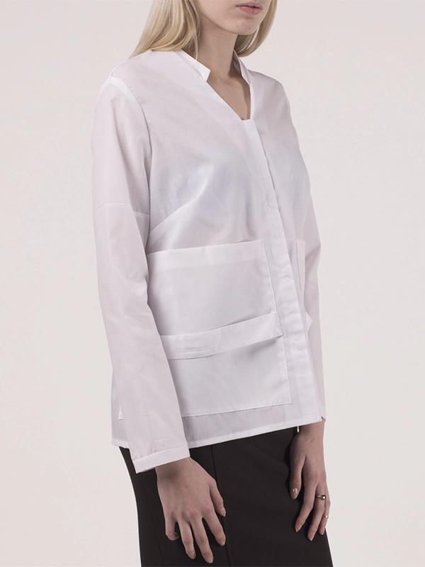 5. Дизайнерская белая рубашка свободного кроя с длинным рукавом. Декорирована большими карманами, заходящими на спинку.