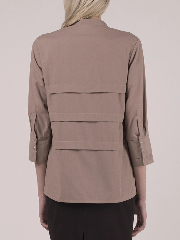 2. Дизайнерская бежевая рубашка свободного кроя. Складочки по спинке и на карманах спереди. Рукав 3/4 с двойной манжетой на одном рукаве.