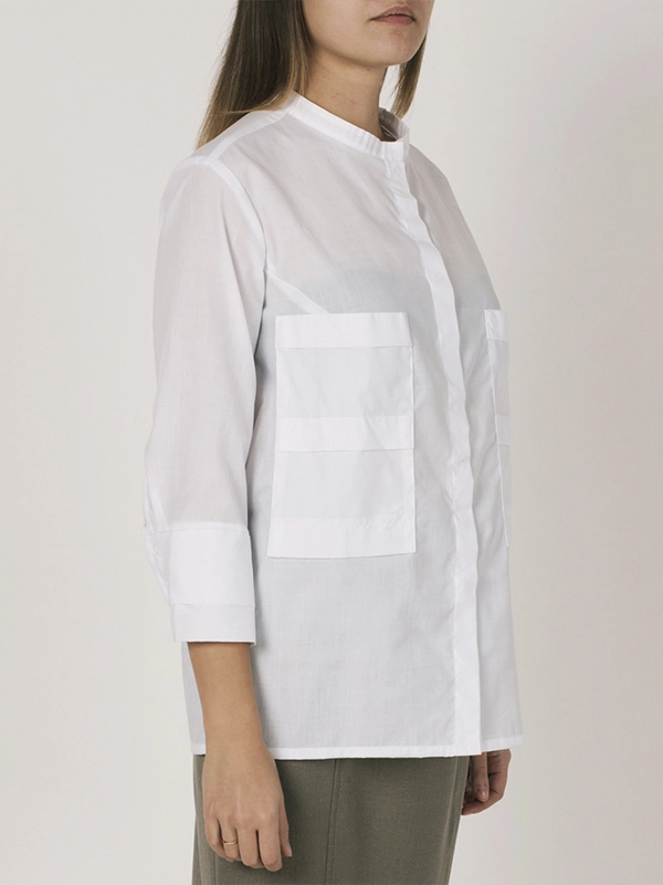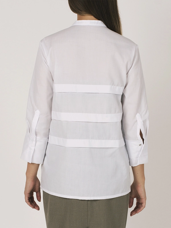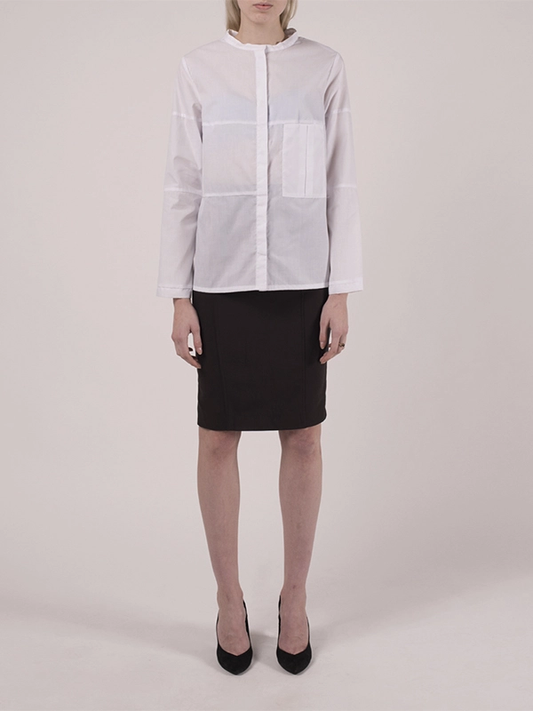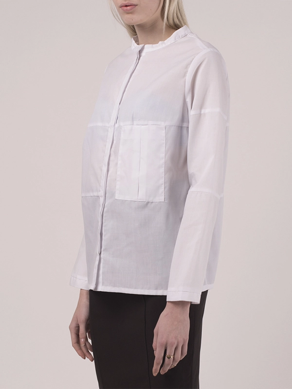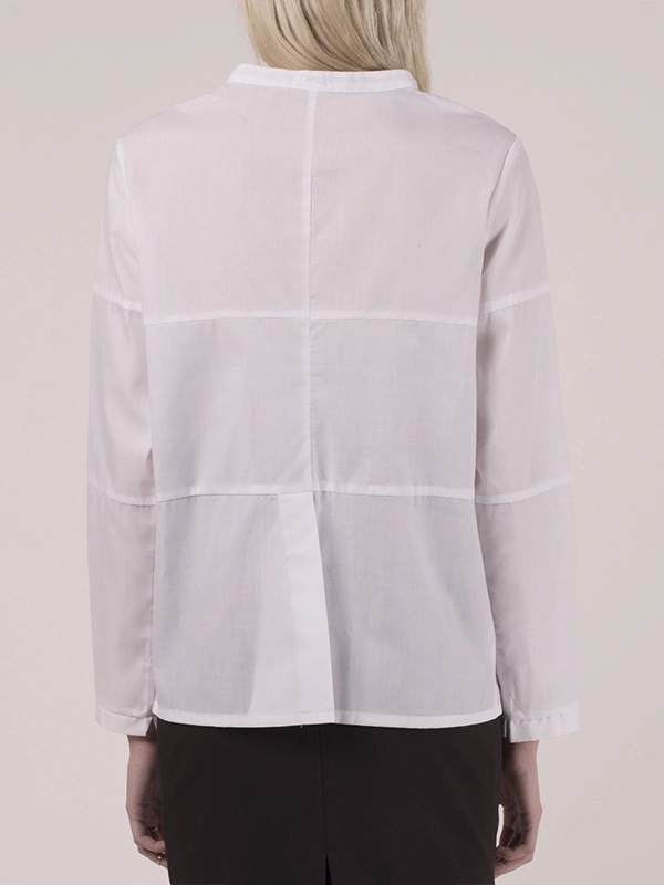 3. Дизайнерская белая рубашка свободного кроя с асимметричными декоративными швами. Спереди один карман со складкой. Сзади шлица. Длинный рукав.