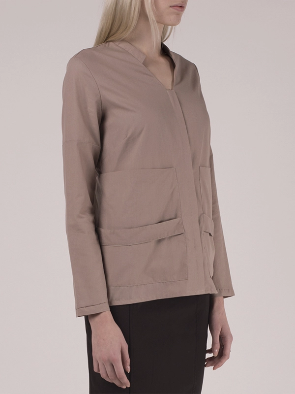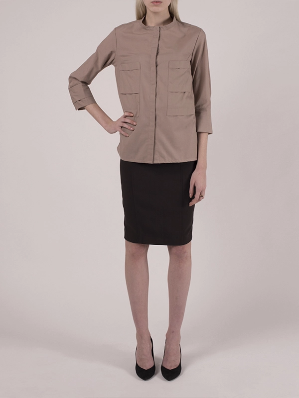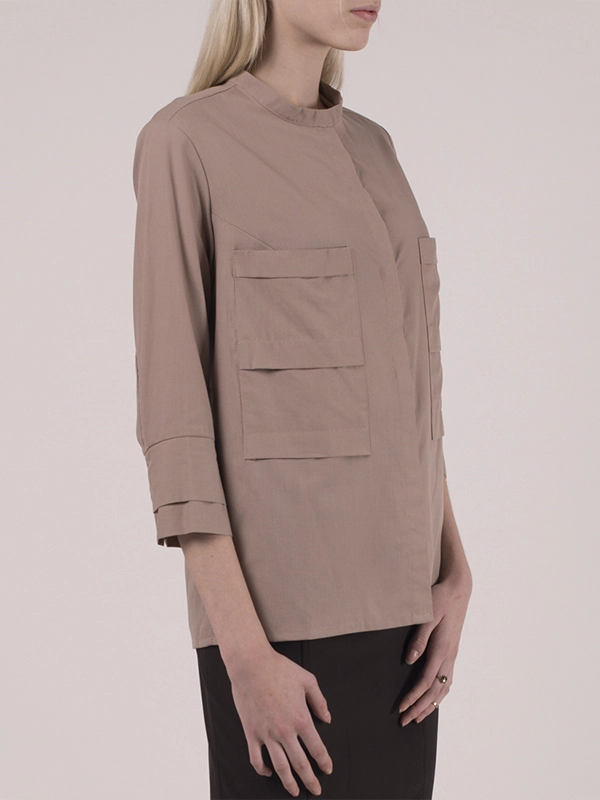 6. Дизайнерская бежевая рубашка свободного кроя с длинным рукавом. Декорирована большими карманами, заходящими на спинку.