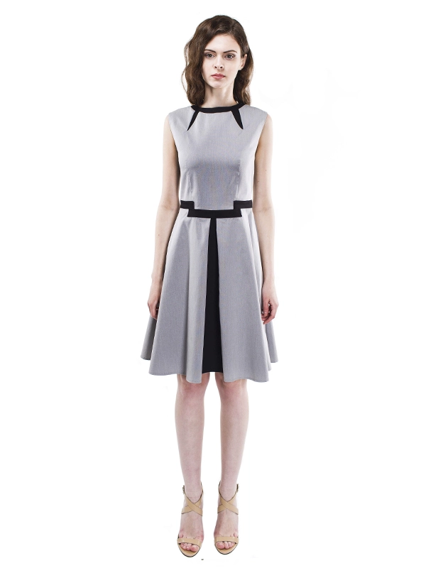 7. Красивое женственное платье серого цвета с черными вставками. Оригинальная горловина с вставками черной ткани. Низ отрезной, полусолнце. На поясе черная вставка. На юбке спереди по центру - черная вставка. Сзади - молния. Ткань - коттон, 98% хб, 2% эластан, средней плотности