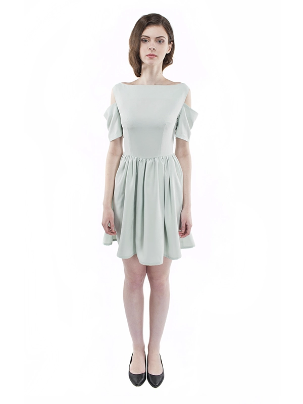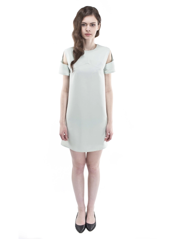 3. Оригинальное платье мятного цвета. Низ - отрезной, в сборку. Верх - по фигуре, горловина - лодочка. Рукава с вырезами, спущенные, спадающие. Сзади замочек. Ткань - шелк