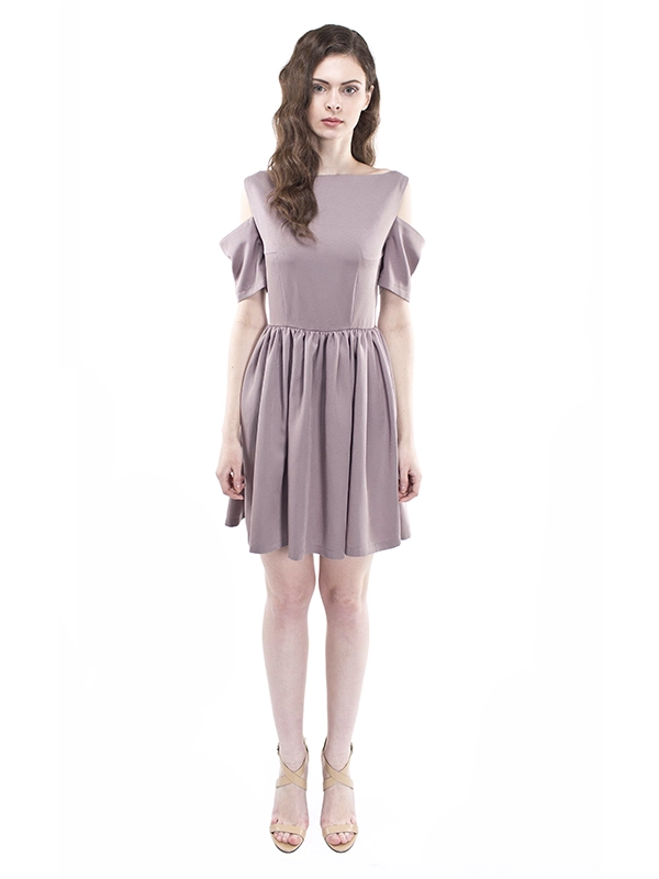 4. Оригинальное платье цвета капучино. Низ - отрезной, в сборку. Верх - по фигуре, горловина - лодочка. Рукава с вырезами, спущенные, спадающие. Сзади замочек. Ткань - костюмная, средней плотности