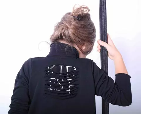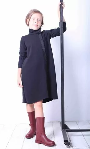 Платье трапеция с высоким горлышком, сзади с оригинальными прорезями Платье трапеция с высоким двойным горлышком. По всей длине застегивается на кнопки. Низ платья асимметричный (сзди длиннее). На спинке оригинальные прорези, сквозь которых виден логотип